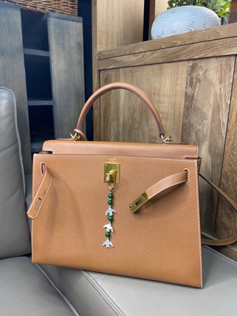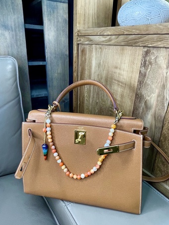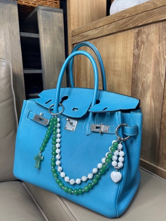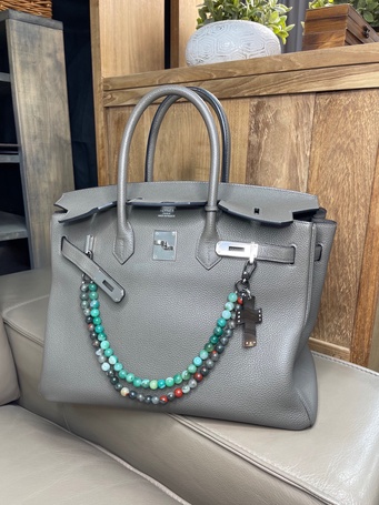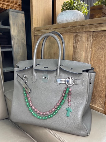 Украшение на сумку с натуральной шпинелью, культивированным жемчугом, зеленым агатом.