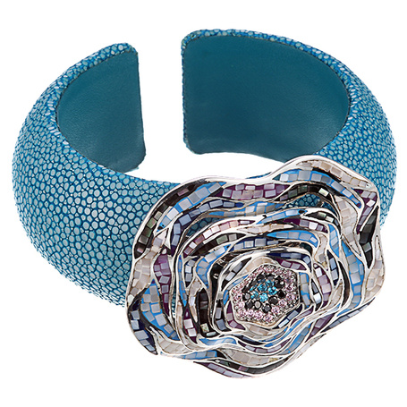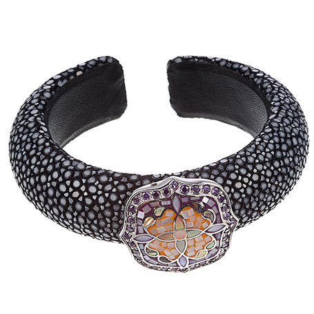 Браслет из серебра 925 пробы с перламутром, эмалью, фианитами и кожей ската