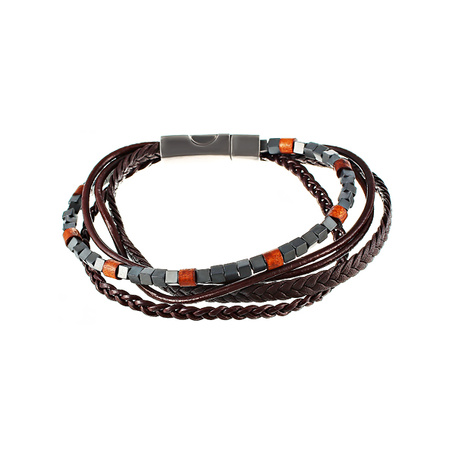 Браслет из стали с кожей тельячьей, гематитами и деревом