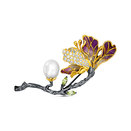 Брошь из серебра 925 пробы с шпинелью, барочным жемчугом, аметистами и эмалями