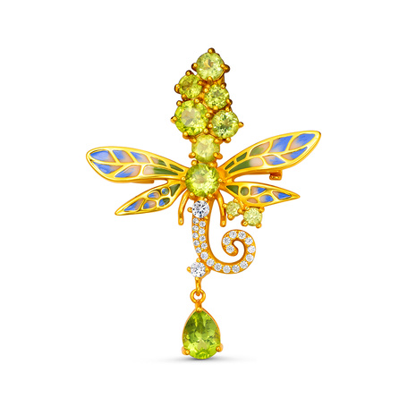 Брошь из серебра 925 пробы с перидотами, фианитами и эмалью