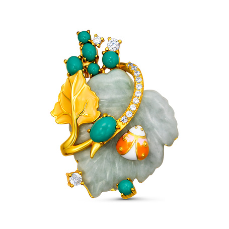 Брошь из серебра 925 пробы с бирюзой синтетической, фианитами, жадеитом и эмалью