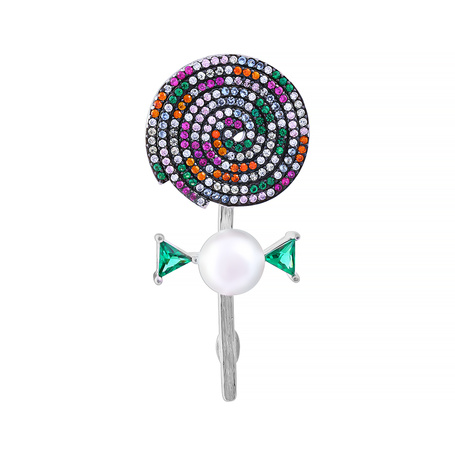 Брошь из серебра 925 пробы с жемчугом майорика, фианитами и ювелирным стеклом