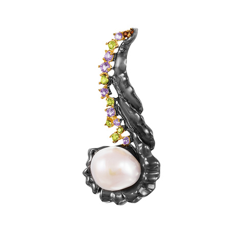 Брошь-подвеска из серебра 925 пробы с аметистами, перидотами и барочным жемчугом