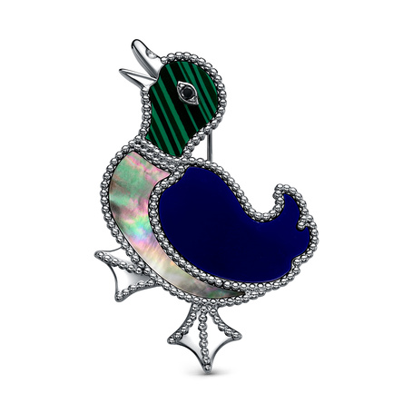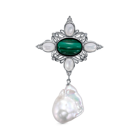 Брошь из серебра 925 пробы с малахитами, перламутром, фианитами и барочным жемчугом