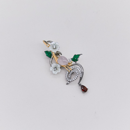 Брошь-подвеска из серебра 925 пробы с кварцем, перламутром, гранатами, топазами и эмалью