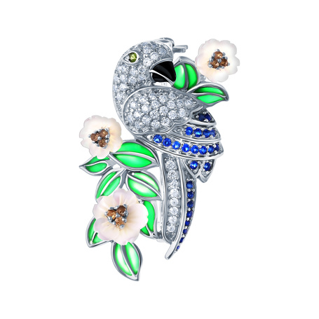 Брошь из серебра 925 пробы с диопсидом, цитринами, перламутром, эмалью и фианитами