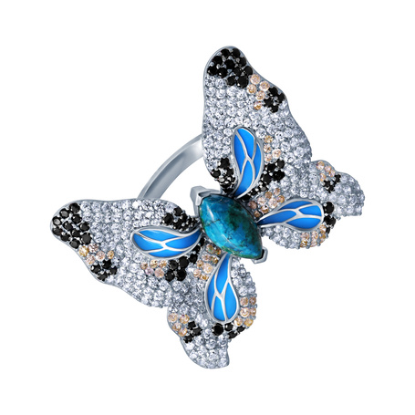 Кольцо из серебра 925 пробы с хризоколлами, шпинелью, эмалью и фианитами