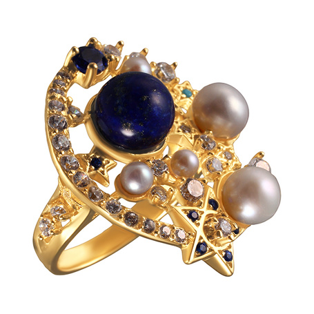 Кольцо из серебра 925 пробы с лазуритами, жемчугом майорика, шпинелью синтетической и фианитами