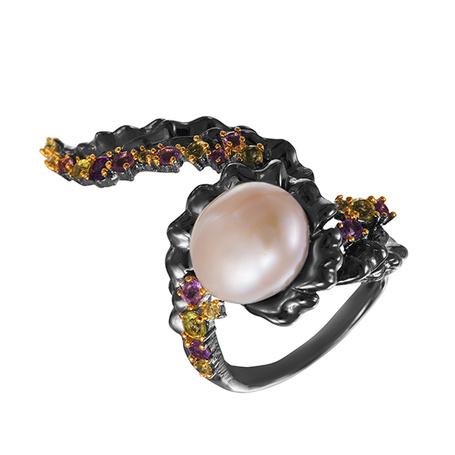 Кольцо из серебра 925 пробы с аметистами, перидотами и барочным жемчугом