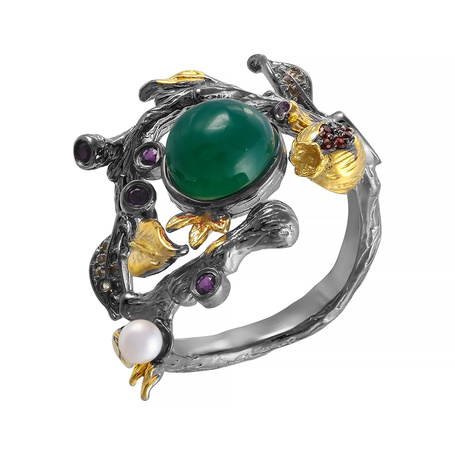 Кольцо из серебра 925 пробы с аметистами, агатом, перидотами и жемчугами