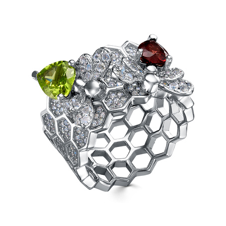 Кольцо из серебра 925 пробы с гранатами, перидотами и топазами
