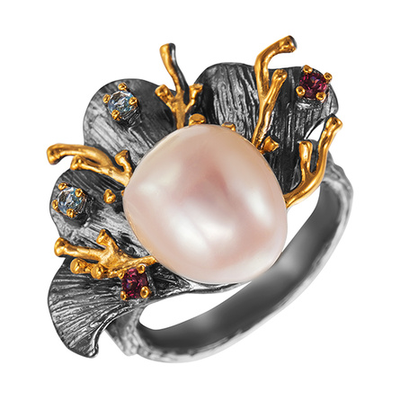 Кольцо из серебра 925 пробы с родолитами, топазами, перидотами и барочным жемчугом