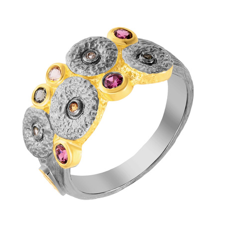 Кольцо из серебра 925 пробы с родонитами, турмалинами и цитринами