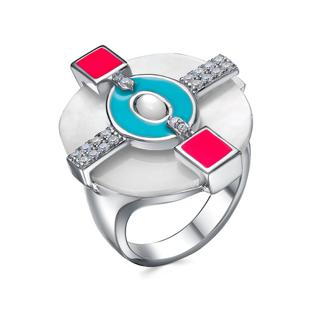 Кольцо из серебра 925 пробы с перламутром, эмалью и фианитами