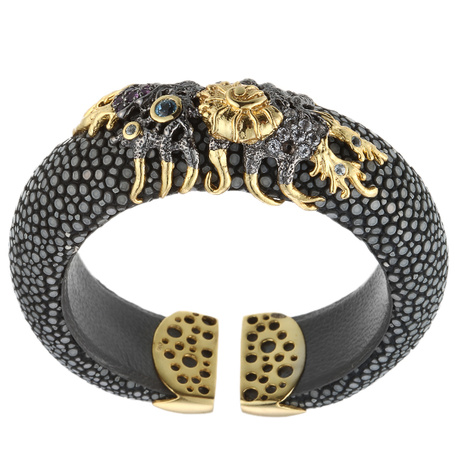 Браслет из серебра 925 пробы с цветными полудрагоценными камнями и кожей ската