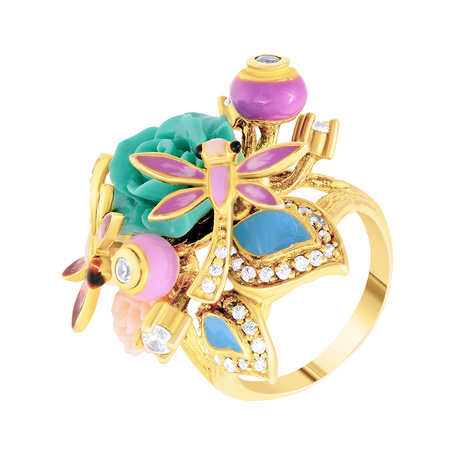 Кольцо из серебра 925 пробы с фианитами, жемчугами, силиконом и эмалью