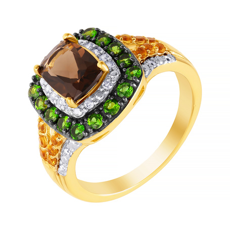 Кольцо из серебра 925 пробы с раухтопазами, хромдиопсидом и цитринами