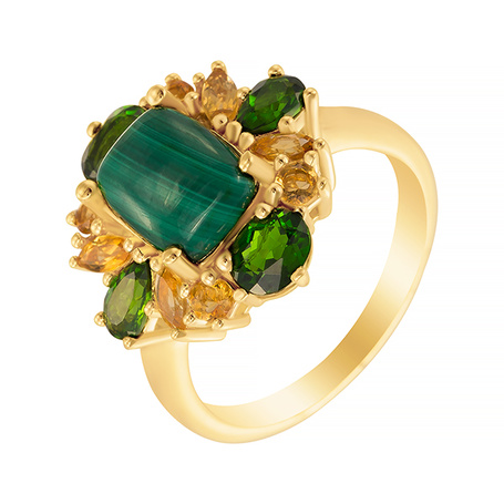 Кольцо из серебра 925 пробы с малахитами, хромдиопсидом и цитринами