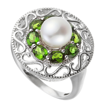 Кольцо из серебра 925 пробы с жемчугом и хромдиопсидом