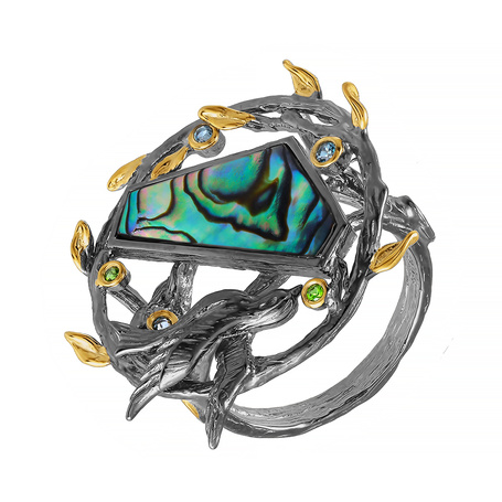 Кольцо из серебра 925 пробы с жемчугом абалон, хромдиопсидом и топазами лондон