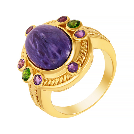 Кольцо из серебра 925 пробы с чароитами, хромдиопсидом и аметистами