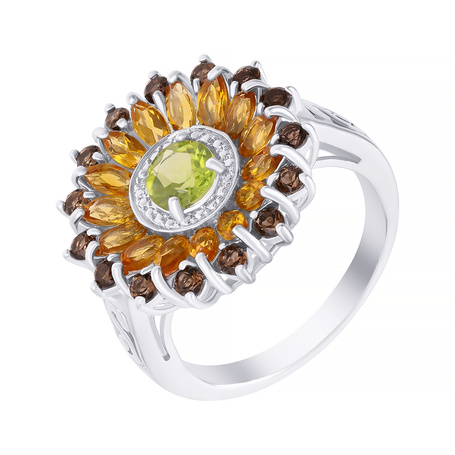 Кольцо из серебра 925 пробы с перидотами, цитринами и раухтопазами