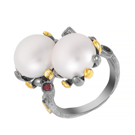 Кольцо из серебра 925 пробы с родолитами и жемчугами