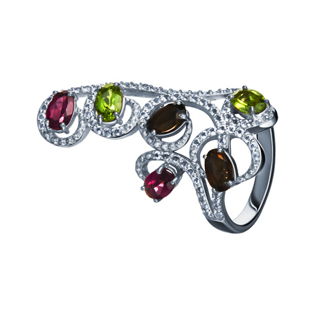 Кольцо из серебра 925 пробы с перидотами, раухтопазами и родолитами