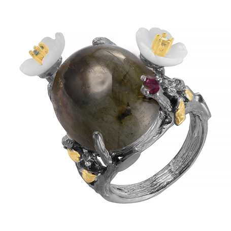Кольцо из серебра 925 пробы с лабрадоритами, родолитами и перламутром