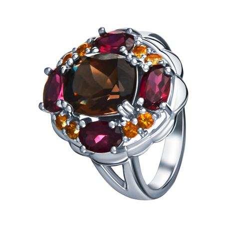 Кольцо из серебра 925 пробы с раухтопазами, родолитами и цитринами