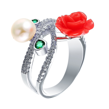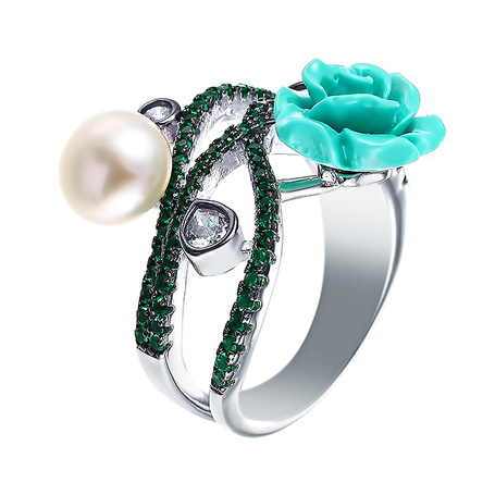 Кольцо из серебра 925 пробы с жемчугом, силиконом, эмалью и фианитами
