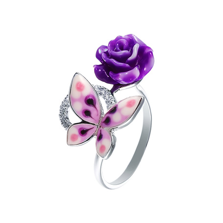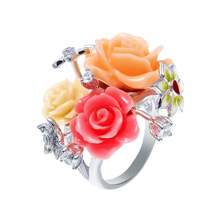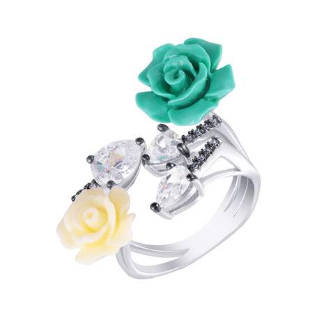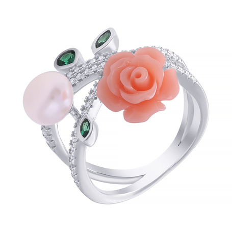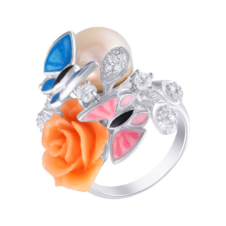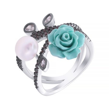Кольцо из серебра 925 пробы с кварцем, жемчугом, силиконом, эмалью и фианитами