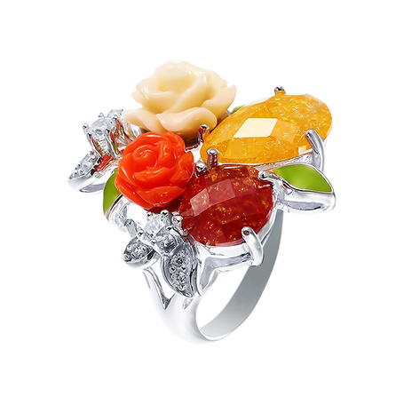 Кольцо из серебра 925 пробы с цитрином, жемчугом, силиконом, эмалью и фианитами