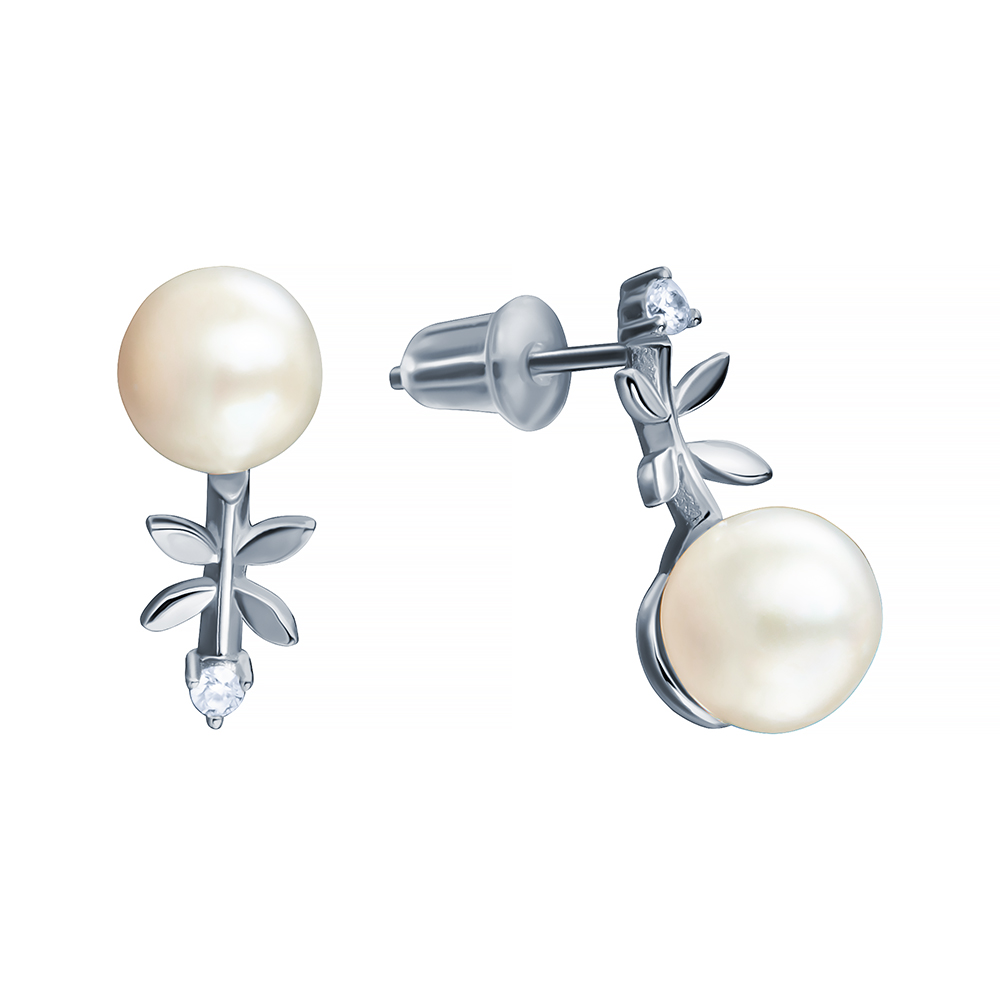 Асимметричные серьги из серебра 925 пробы с фианитами и жемчугами