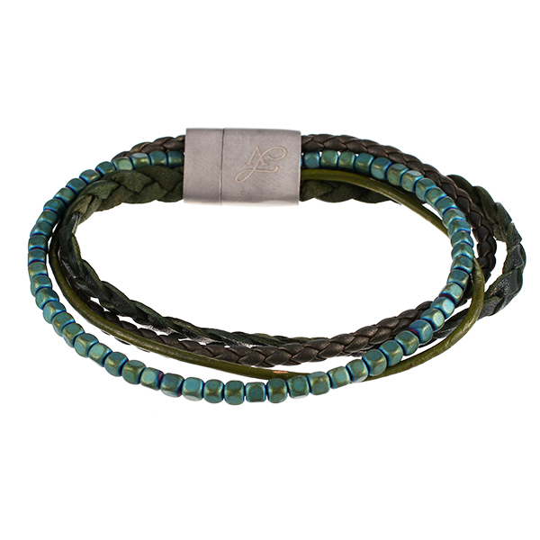 Браслет из стали с гематитами, кожей тельячьей и сталью