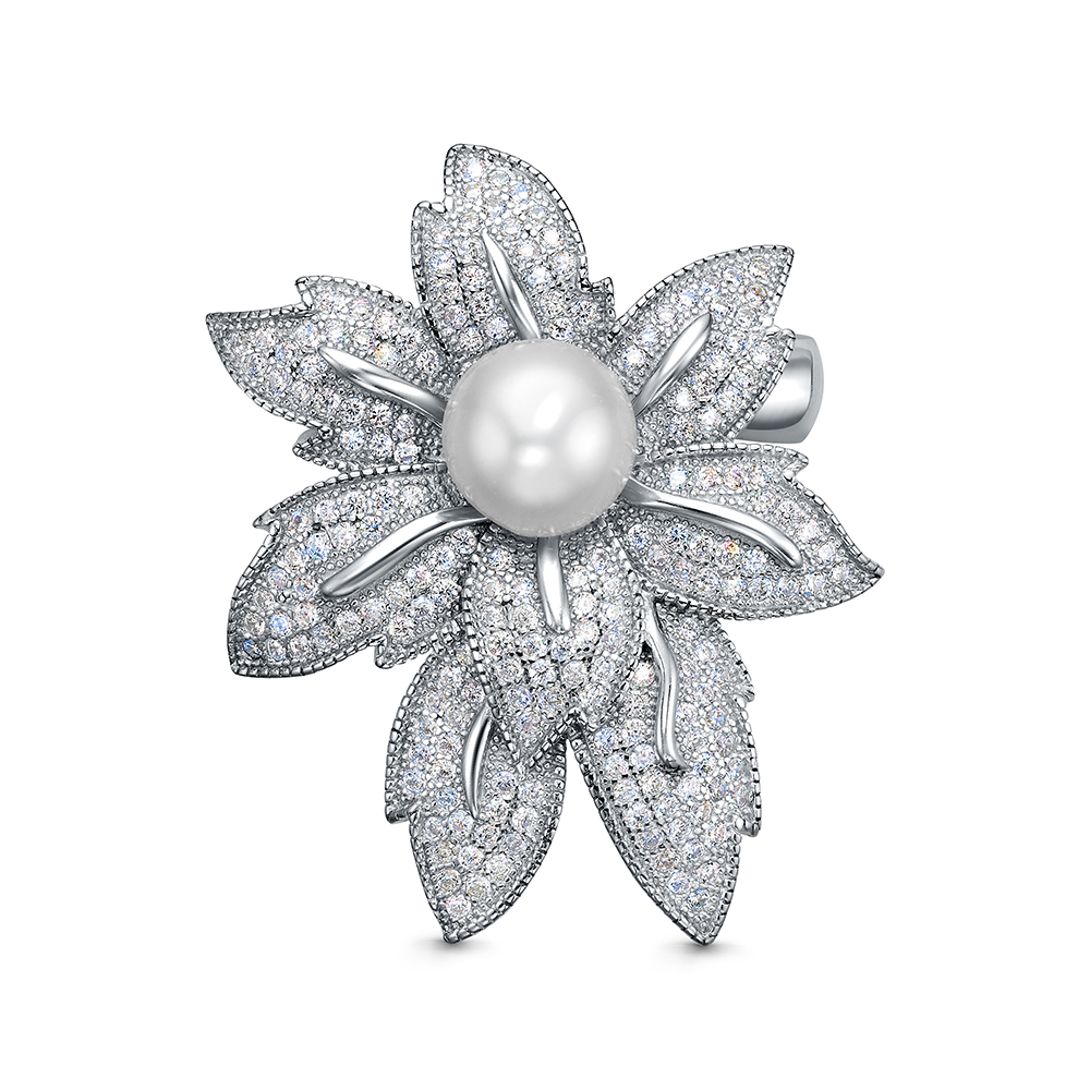 Брошь из серебра 925 пробы с фианитами и жемчугами речными