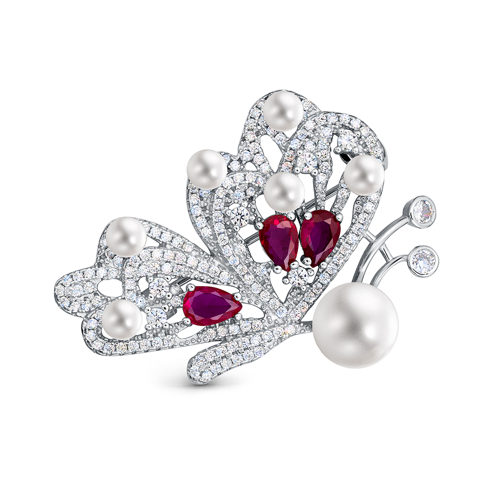 Брошь из серебра 925 пробы с фианитами и жемчугами речными