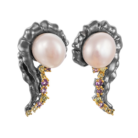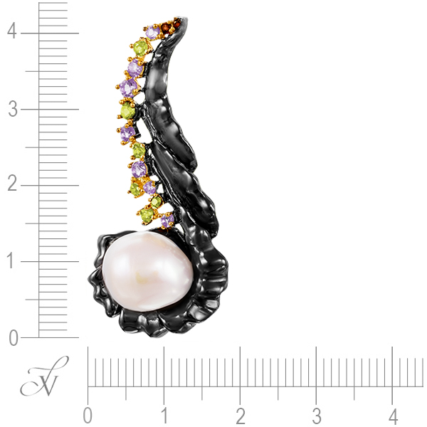 Брошь-подвеска из серебра 925 пробы с аметистами, перидотами и барочным жемчугом