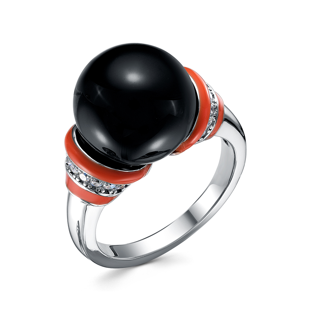 Кольцо из серебра 925 пробы с эмалью, ониксом и фианитами