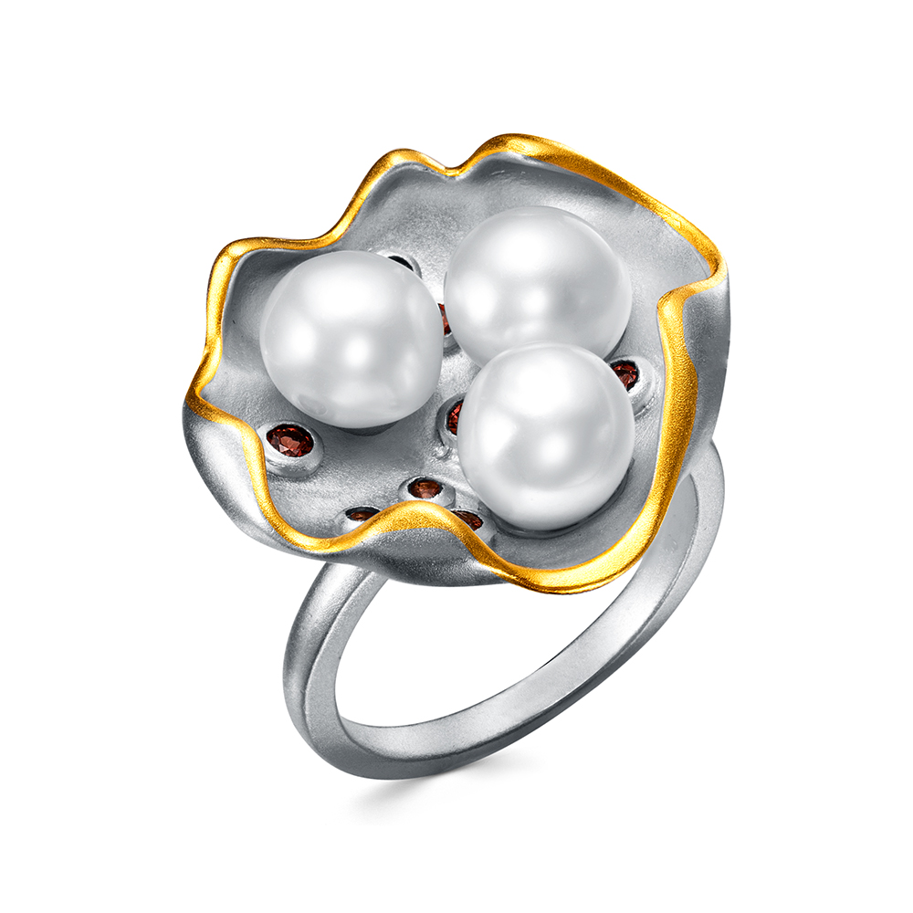 Кольцо из серебра 925 пробы с гранатами и барочным жемчугом