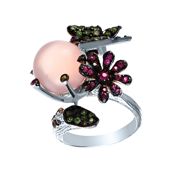 Кольцо из серебра 925 пробы с кварцем, сапфирами и цаворитами