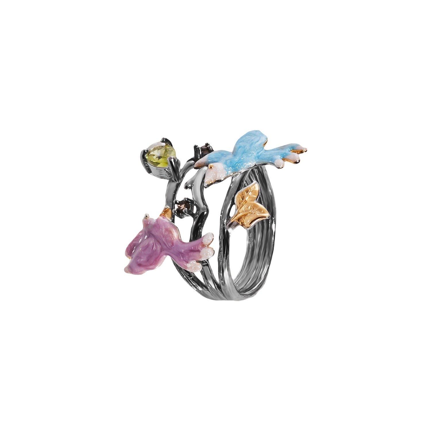 Кольцо из серебра 925 пробы с перидотами, раухтопазами и эмалью
