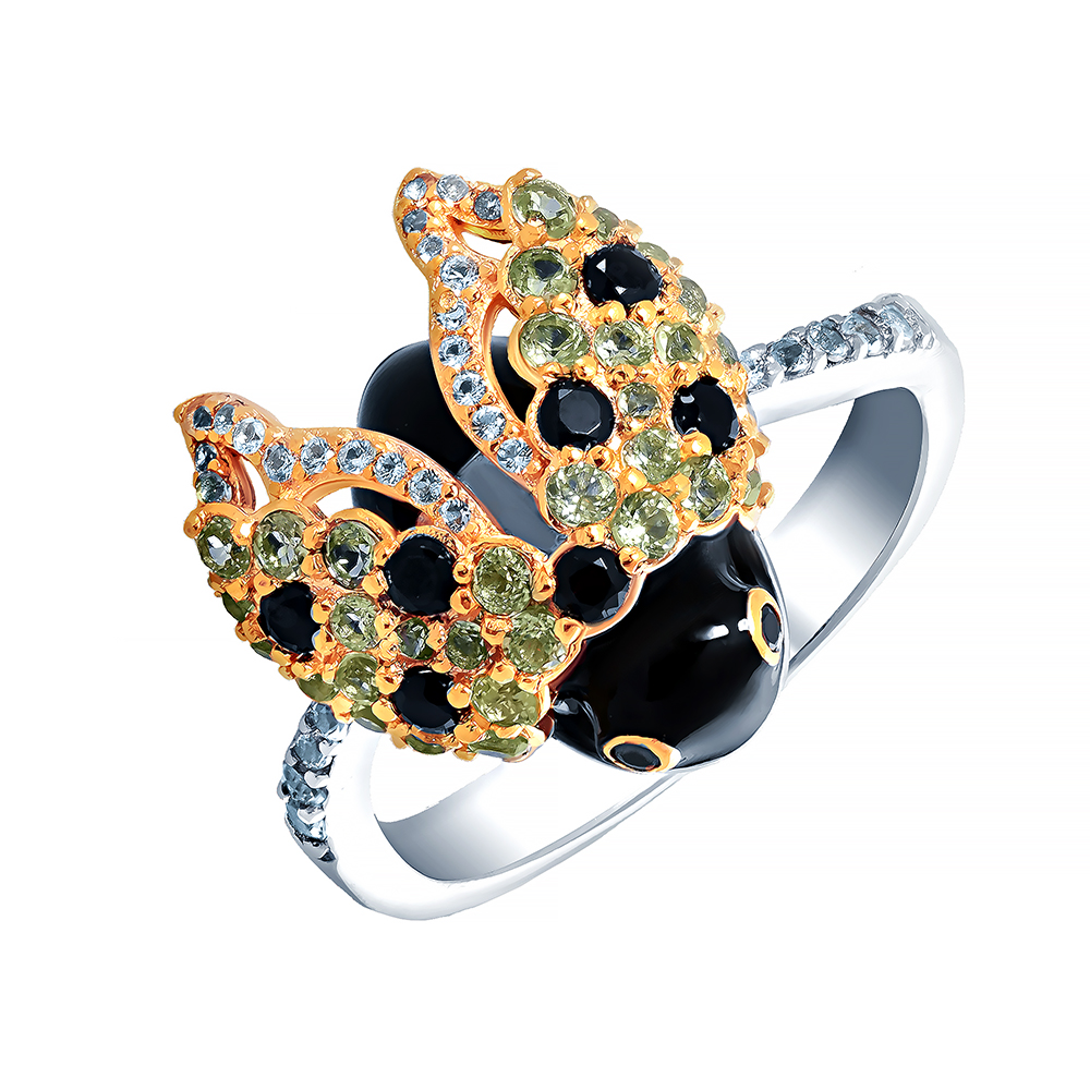 Кольцо из серебра 925 пробы с перидотами, топазами, шпинелью и эмалью