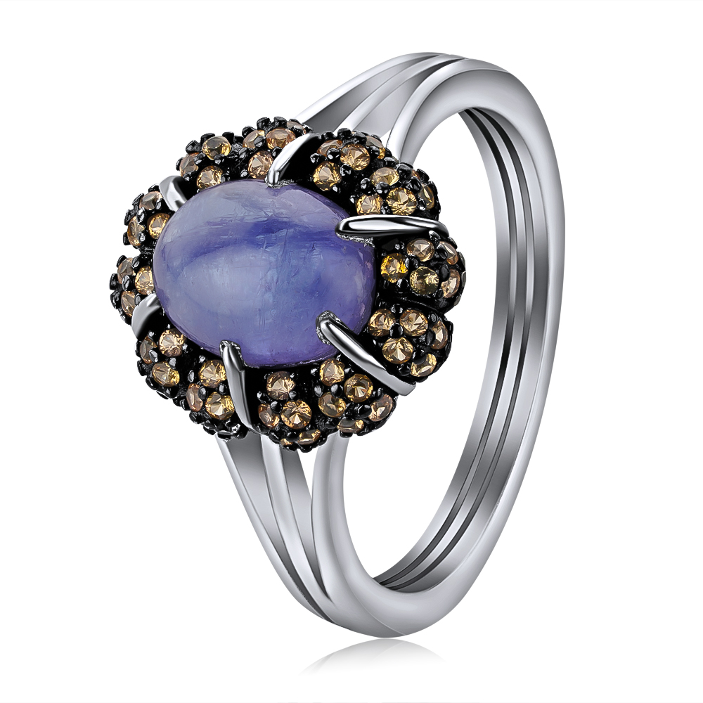 Серебряное кольцо 925 пробы, камни - сапфир желтый, танзанит синий