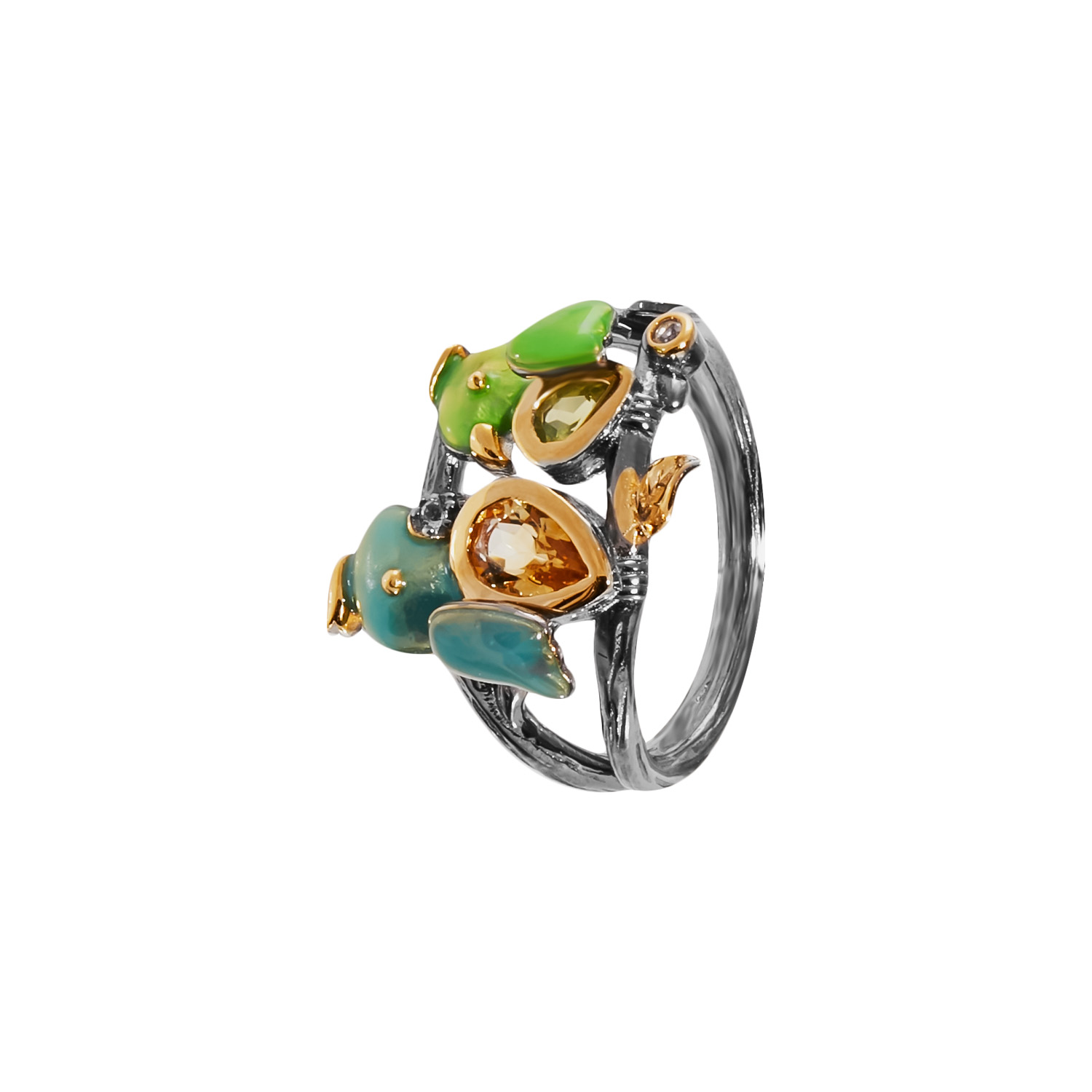 Кольцо из серебра 925 пробы с цитринами, перидотами, топазами и эмалью