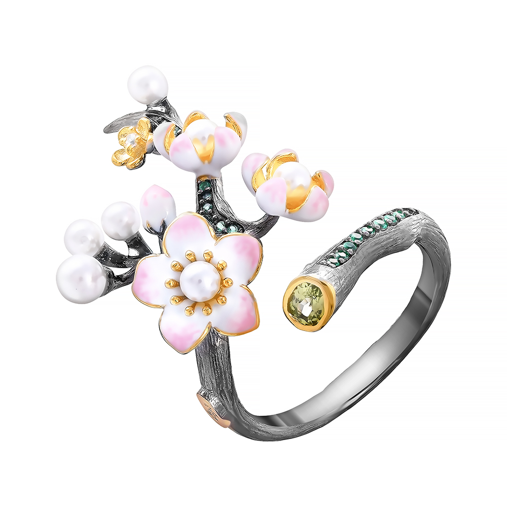 Кольцо из серебра 925 пробы с жемчугами, фианитами, перидотами и эмалью