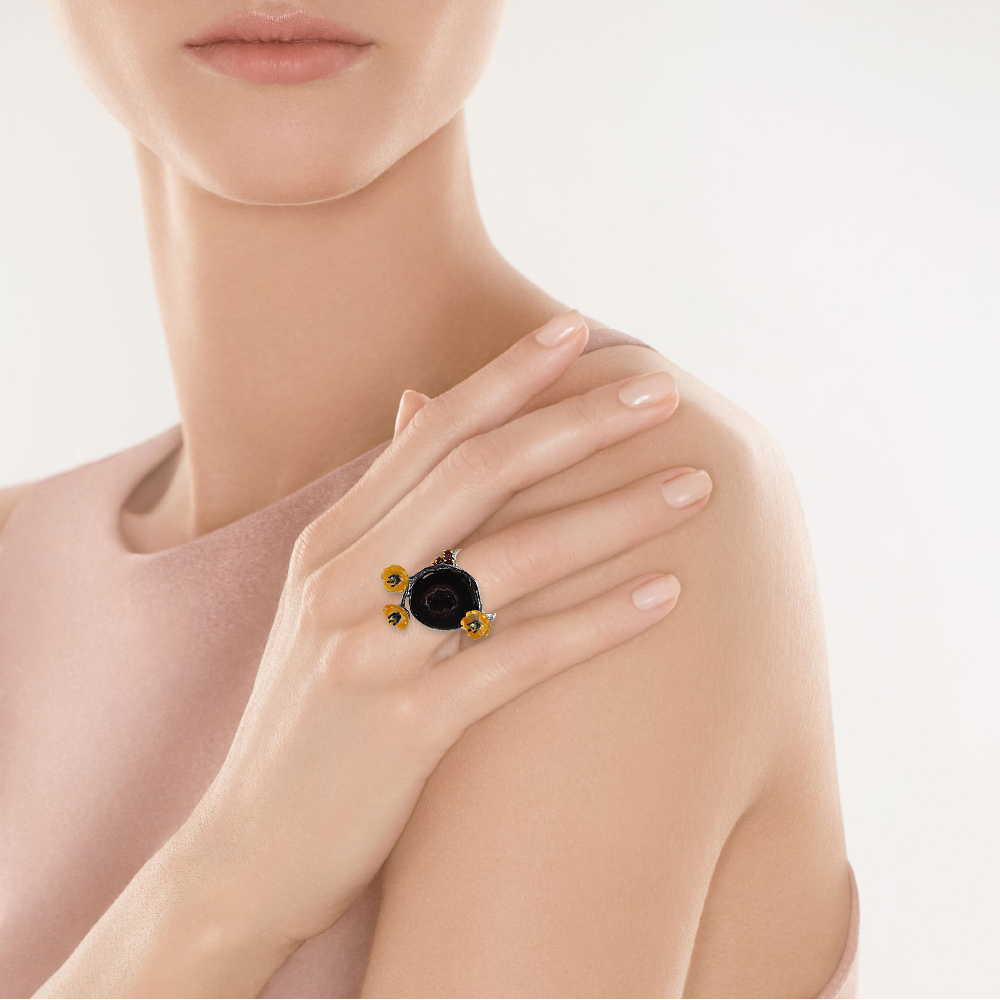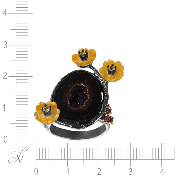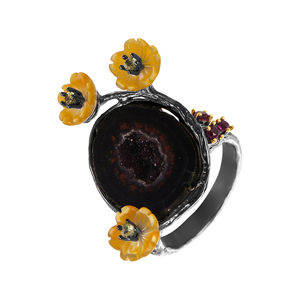Кольцо из серебра 925 пробы с жеодами, перидотами, родолитами и перламутром