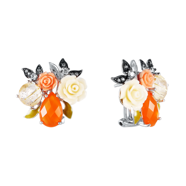 Серьги из серебра 925 пробы с агатом, кварцем, силиконом и фианитами