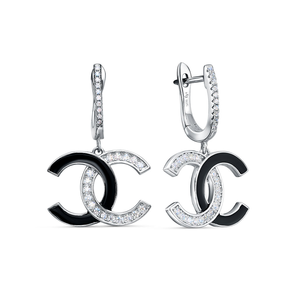 Серебряные серьги 925 пробы, камни - фианит, эмаль черный